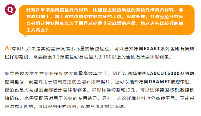 針對(duì)上述問題,我們目前可以為用戶提供多種品牌的、可供選擇的樣件加工技術(shù)和設(shè)備。例如德國EXAKT系列機(jī)械式金剛石復(fù)材試樣切割帶鋸;美國LABCUT5000系列復(fù)材板樣件切割數(shù)控圓盤鋸;德國DRAMET金剛石數(shù)控帶鋸和數(shù)控線鋸;德國ISEL異形件數(shù)控銑鉆機(jī)床等。從加工樣件的形狀上,可以加工矩形樣件,啞鈴型、V型口、槽型口、臺(tái)階型、錐形等異形樣件以及打孔;加工的復(fù)合材料包括碳纖維、玻纖、芳綸、金屬基復(fù)合材料、蜂窩復(fù)合材料、礦物質(zhì)復(fù)合材料、納米復(fù)合材料、增材、橡膠復(fù)合材料等。既有解決實(shí)驗(yàn)室研發(fā)用小批量的樣件加工設(shè)備;又有滿足質(zhì)控檢驗(yàn)需要的大批量多批次高效率的加工需求設(shè)備。上述設(shè)備均適應(yīng)干切或濕切方式,配套了干切除塵、冷卻過濾系統(tǒng)和激光定位系統(tǒng)。